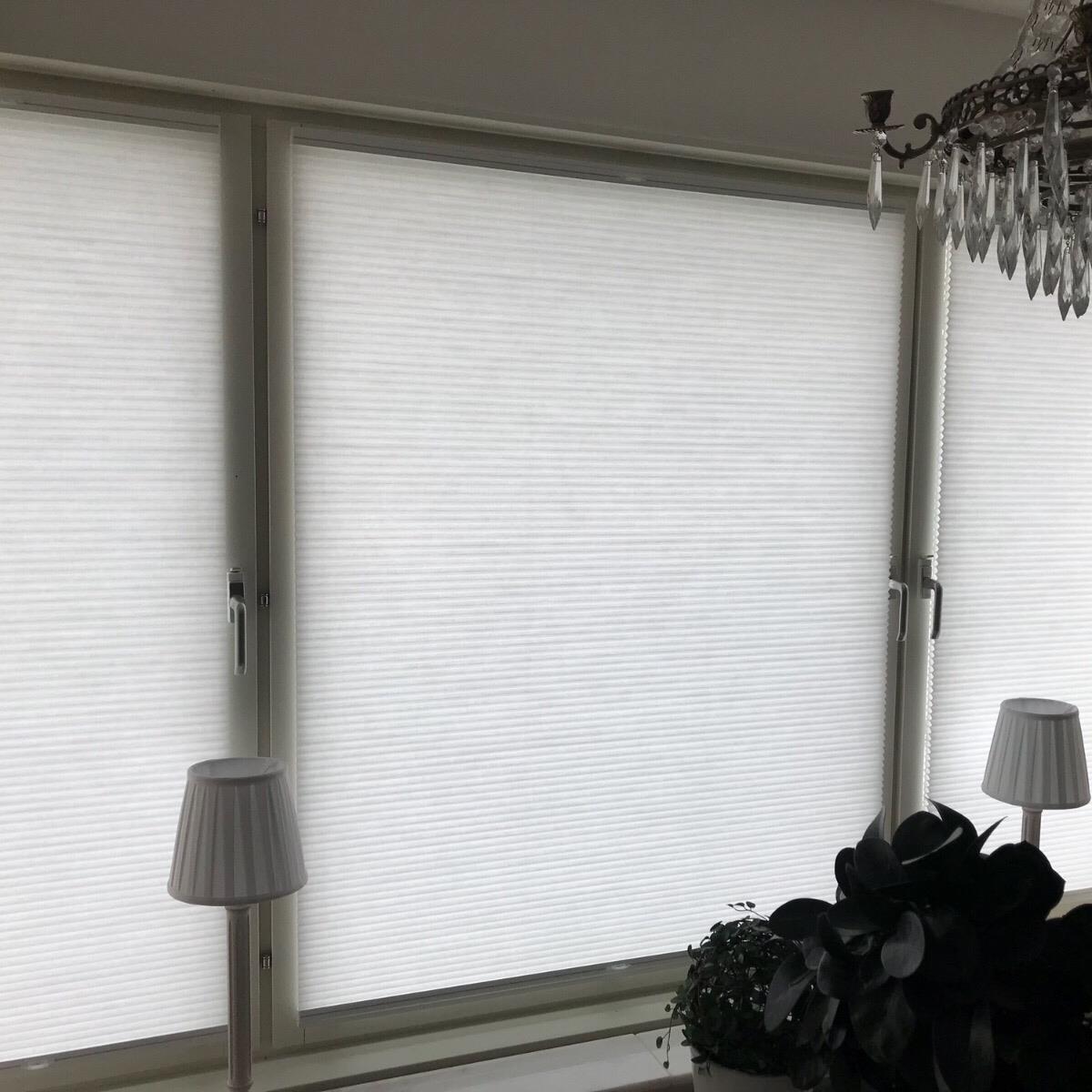 Vi installerade modellen Ingrid duettegardin från Hestra Markis. Gardinen är uppbyggd av dubbla cellvävar som isolerar mot kyla på vintern och stänger ute värme på sommaren. Den ger effektivt insynsskydd och kan enkelt justeras för att släppa in precis så mycket ljus som önskas.