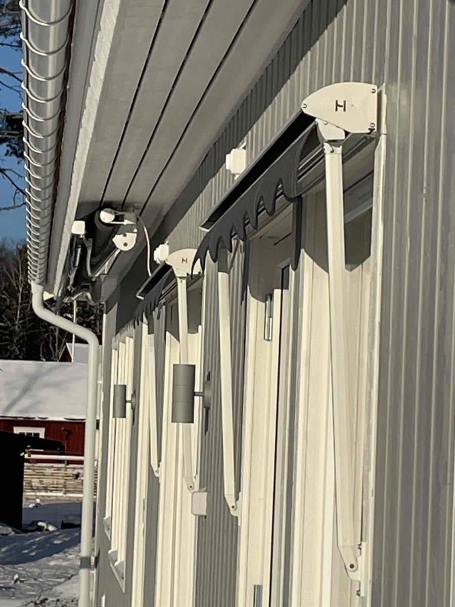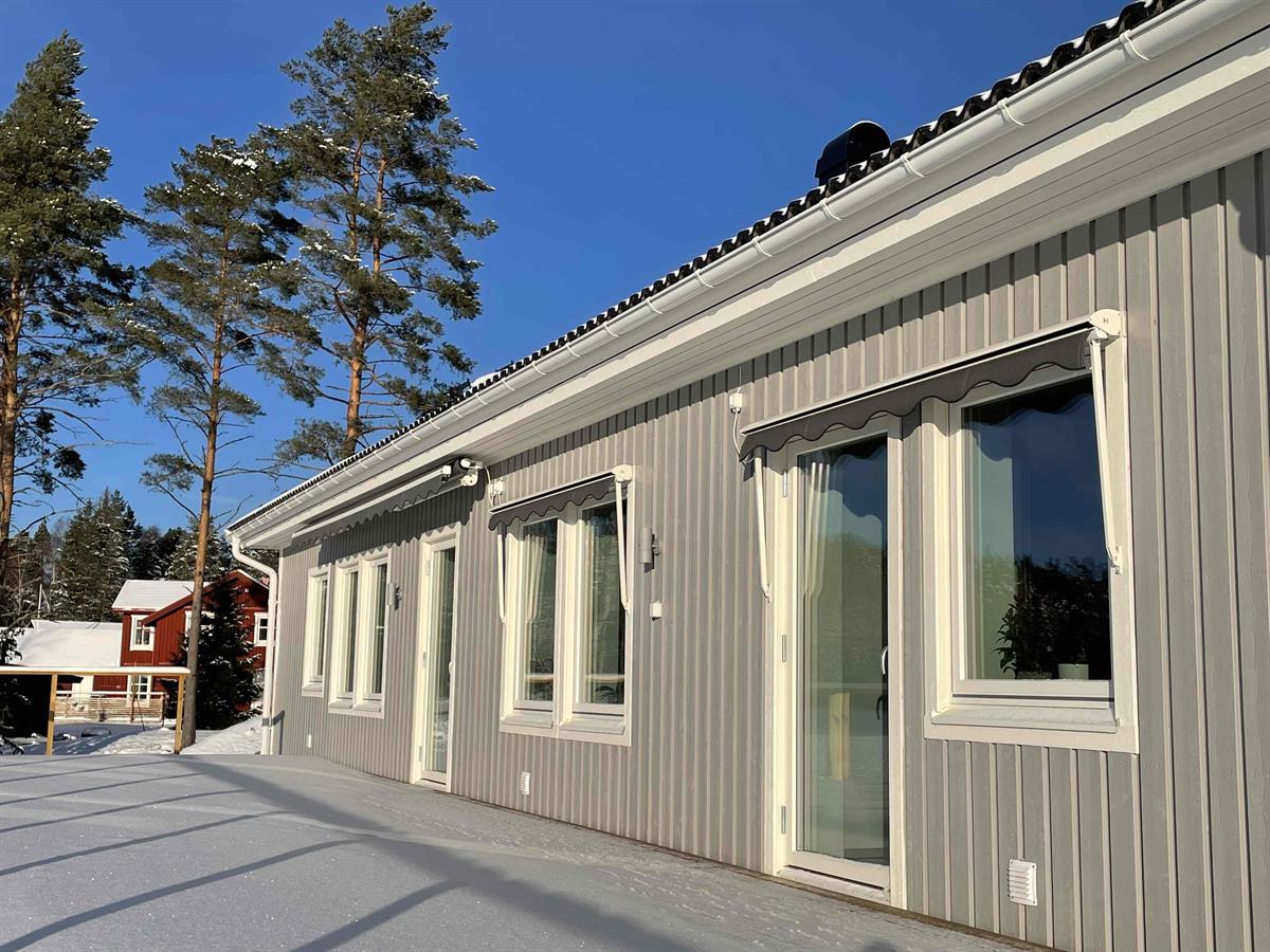 Vi föreslog en kombination av motoriserade fönstermarkiserna av modellen Tage och terrassmarkisen August från Hestra. Fönstermarkiserna håller temperaturen nere inomhus, medan terrassmarkisen skapar skön skugga på altanen. Tack vare motordriften är markiserna enkla att använda och bidrar till en känsla av kvalitet i vardagen.
