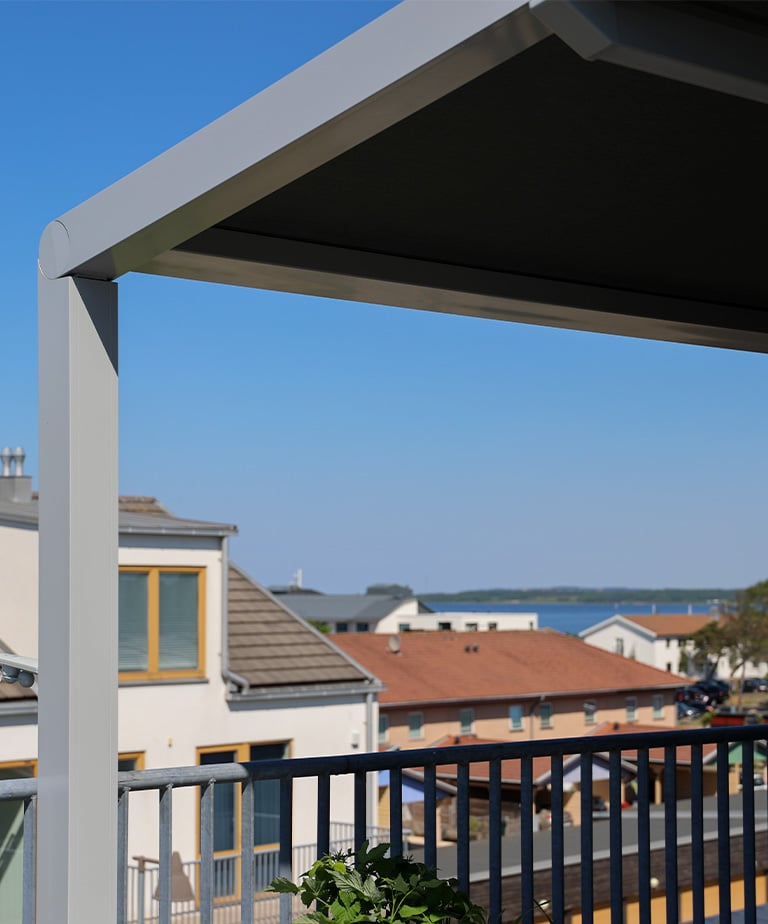 Profilerna finns i grå, vit eller svart struktur och du väljer väv ur en bred kollektion av vattentäta tyger. Vill du skapa stämning under “taket” finns möjlighet att lägga till dimbar LED-belysning. Manövreringen sker med motor via fjärr eller smartphone, och kan automatiseras helt med sol- och vindvakt.