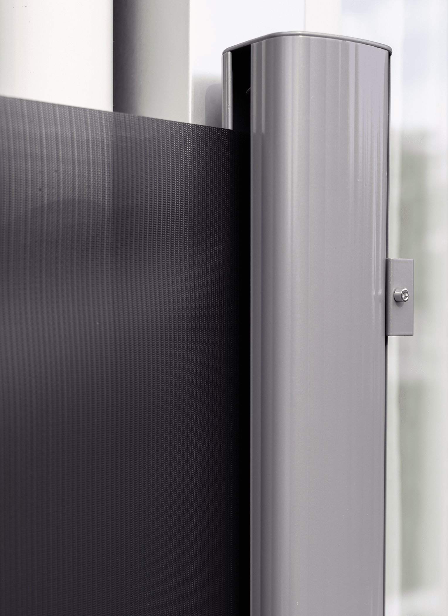 Handkraft är det som gäller för manövrering via ett centralt placerat handtag och fjäder i kassetten. Väven rullas tillbaka in i kassetten och skyddas mot väder och vind, en robust och praktisk lösning för dagen och kvällen.