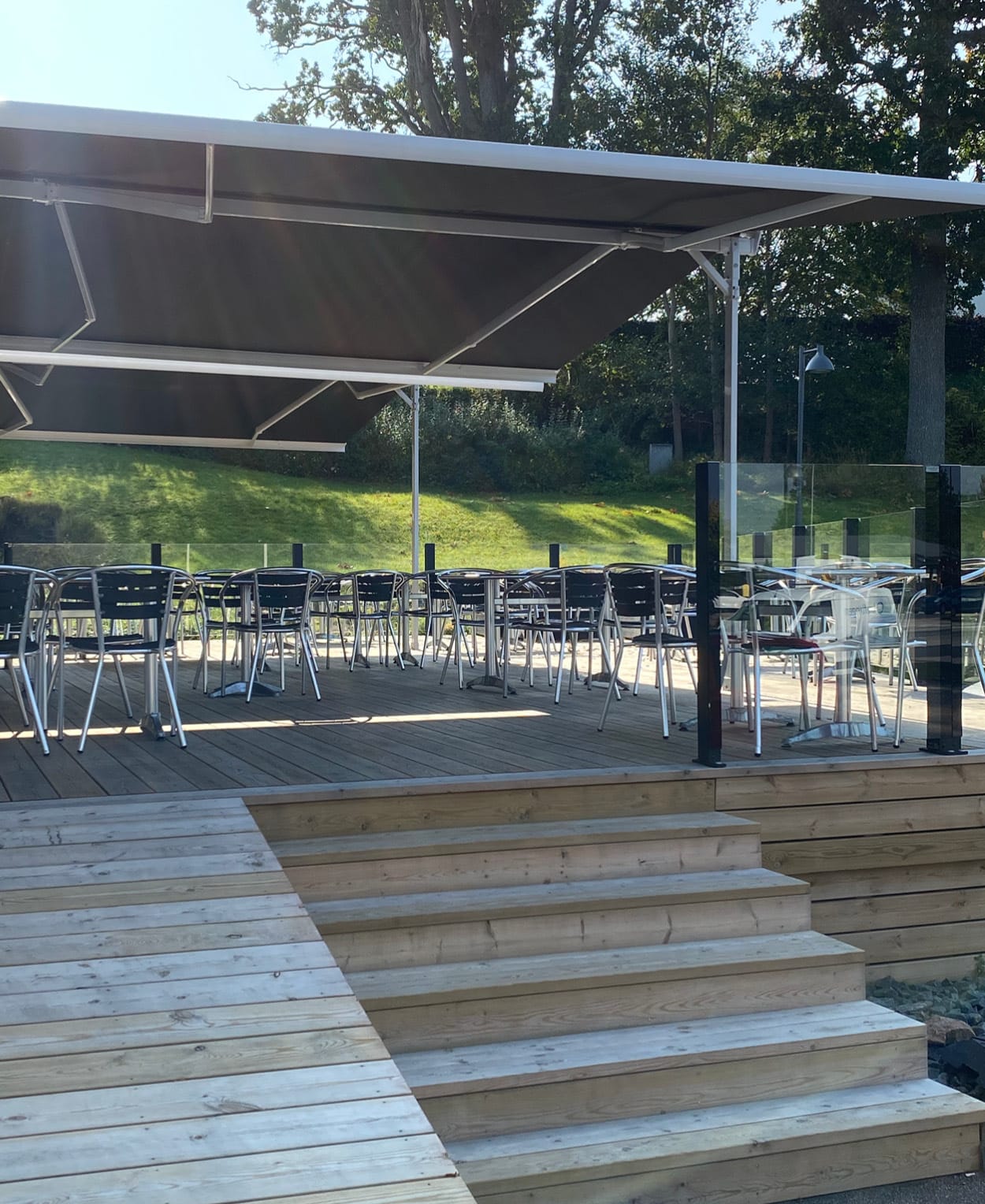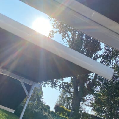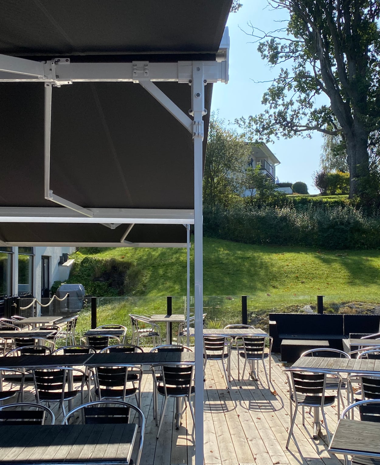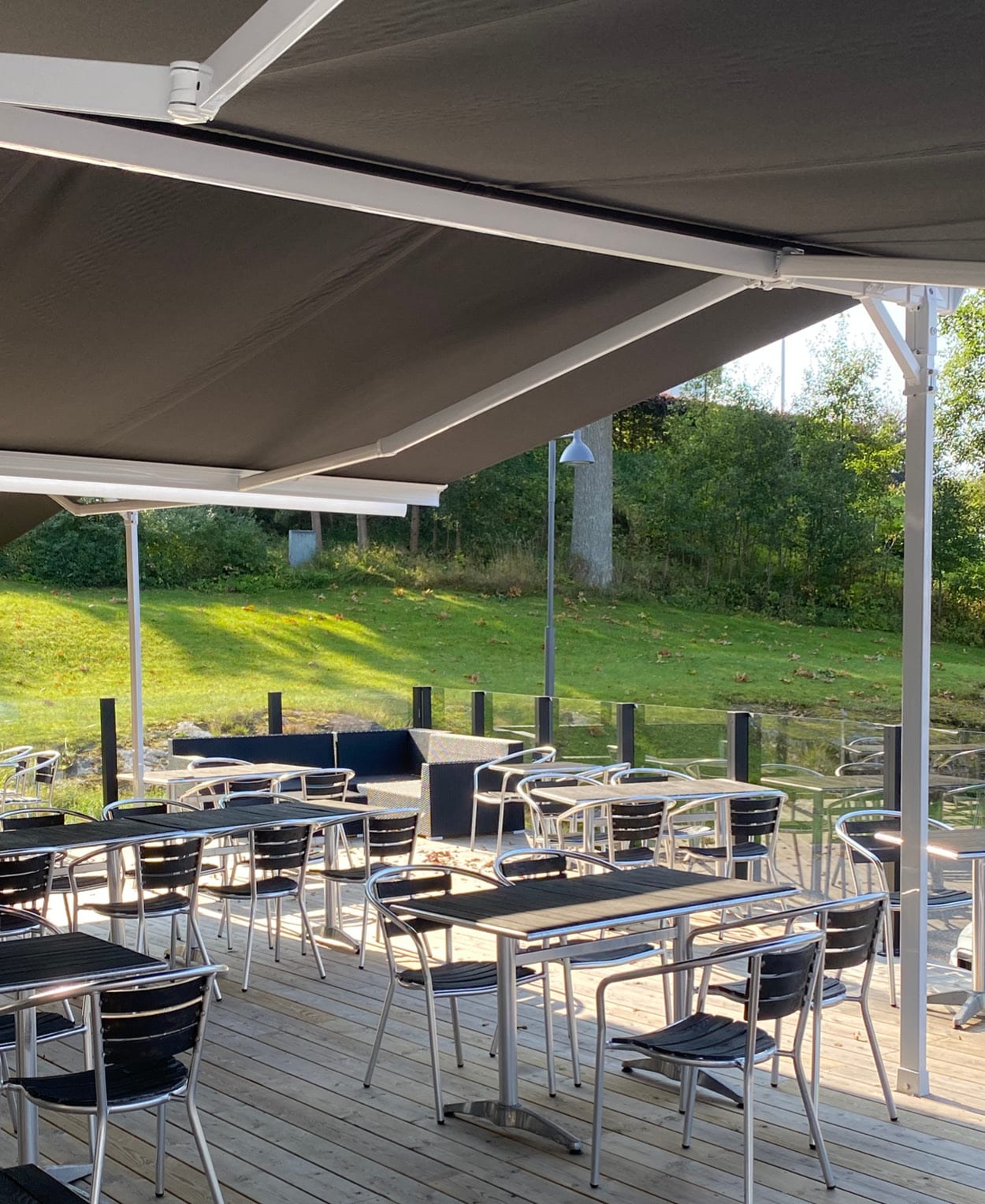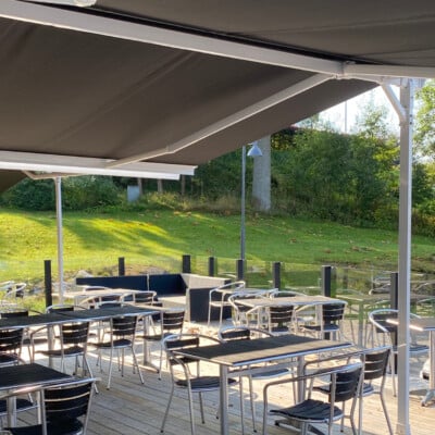 Hestra Helmer är en fristående dubbelterrassmarkis som fungerar som ett extra rum utomhus. Den placeras enkelt på olika underlag utan att kräva väggfästen och skapar ett effektivt skydd mot värme, UV-strålning och bländning.
