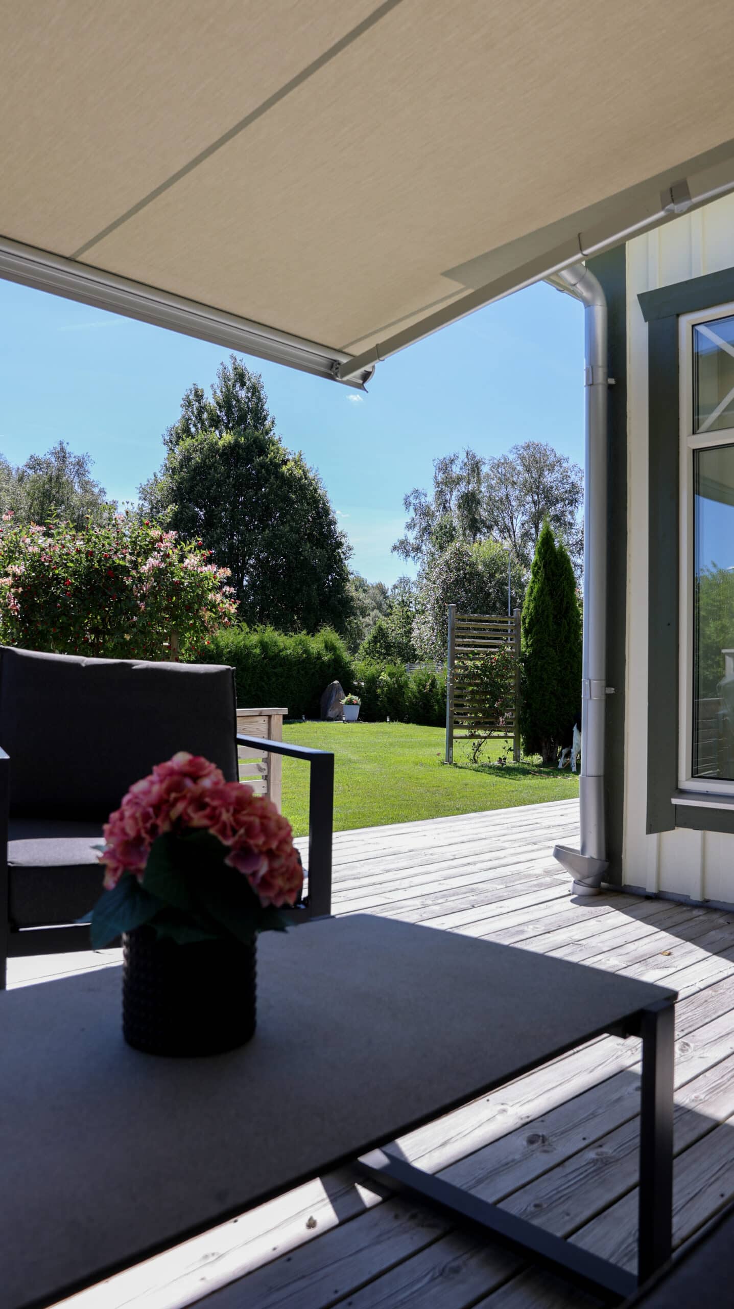 Motordrift ingår som standard och kan styras via fjärrkontroll eller smartphone. För full automatik finns möjlighet till sol- och vindvakt, alternativt finns vevalternativ för den som vill ha manuell hantering.
